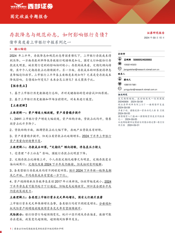 【西部证券】【202409】债市角度看上市银行中报系列之一_存款降息与规范补息,如何影响银行负债?-17页 证券期货研究报告