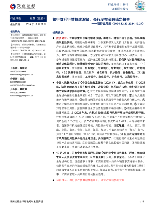 【兴业证券】【20241229】银行业周报:银行红利行情持续演绎,央行发布金融稳定报告-15页 行业研究