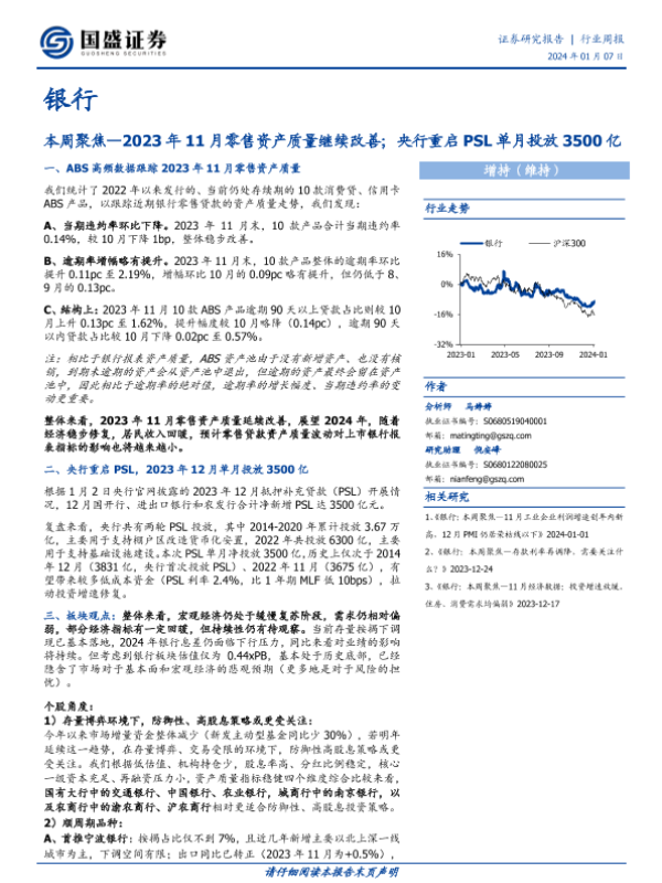 【国盛证券】【20240107】银行本周聚焦:2023年11月零售资产质量继续改善;央行重启PSL单月投放3500亿-12页 行业研究