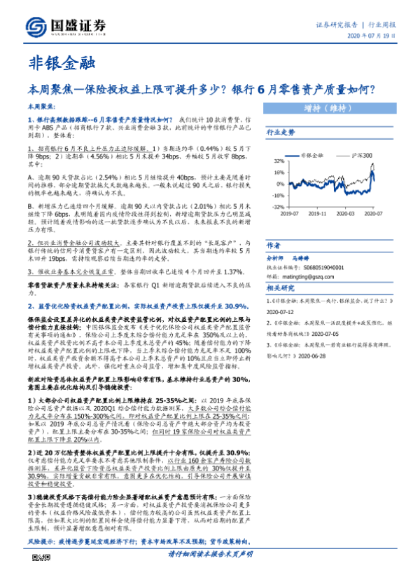 【国盛证券】【20200719】非银金融本周聚焦:保险投权益上限可提升多少?银行6月零售资产质量如何?-15页 行业研究