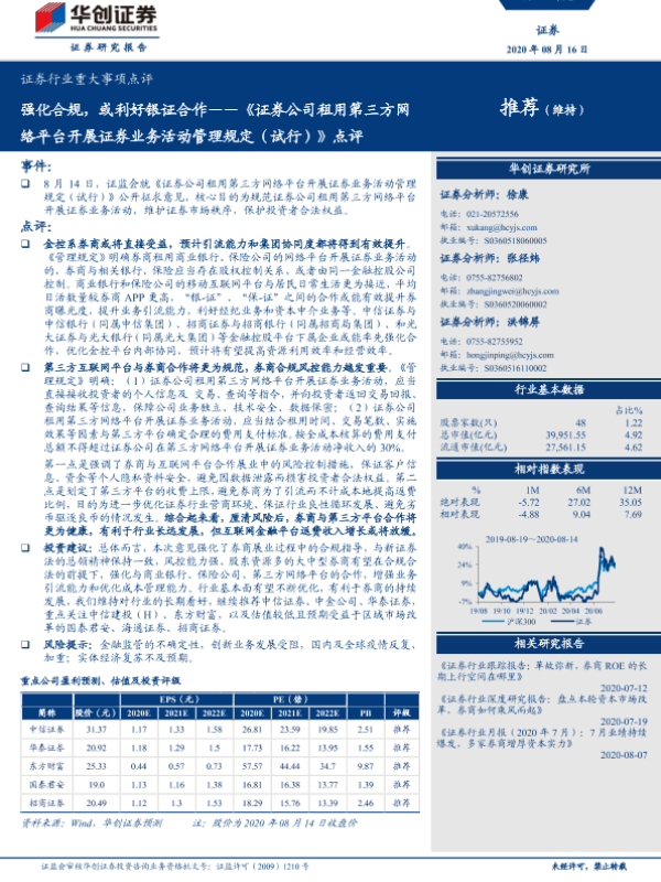 【华创证券】【20200816】强化合规,或利好银证合作——《证券公司租用第三方网络平台开展证券业务活动管理规定(试行)》点评-4页 行业研究