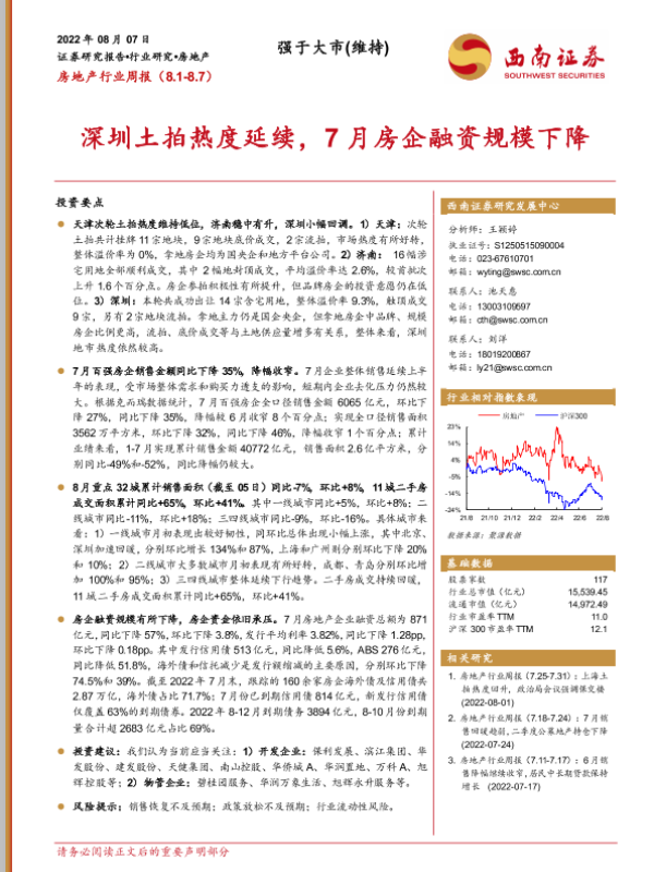 【西南证券】【20220807】房地产行业周报:深圳土拍热度延续,7月房企融资规模下降-15页 行业研究