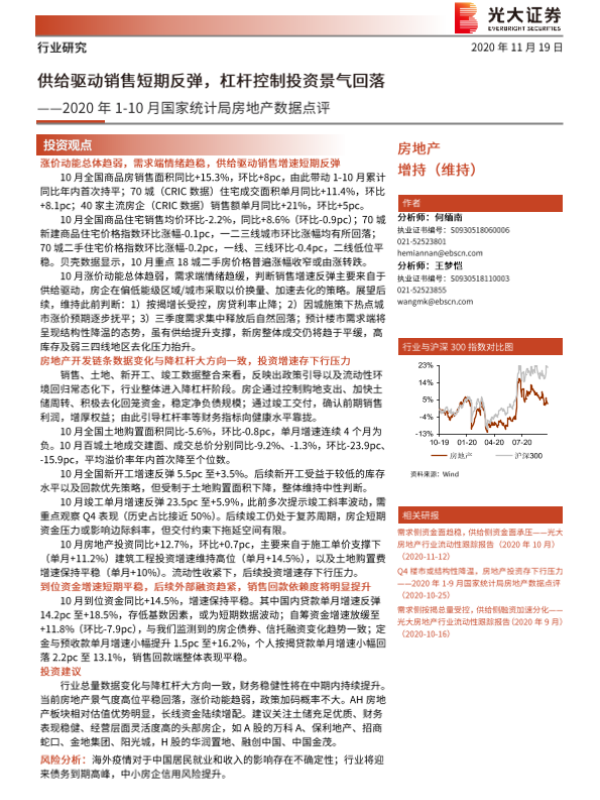 【光大证券】【20201119】2020年1-10月国家统计局房地产数据点评:供给驱动销售短期反弹,杠杆控制投资景气回落-13页 行业研究