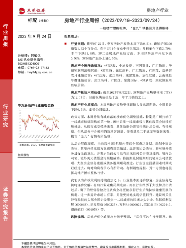 【东莞证券】【20230924】房地产行业周报:一线楼市限购松绑,“金九”销售回升值得期待-12页 行业研究