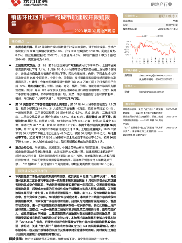 【东方证券】【20230918】2023年第37周地产周报:销售环比回升,二线城市加速放开限购限售-15页 行业研究