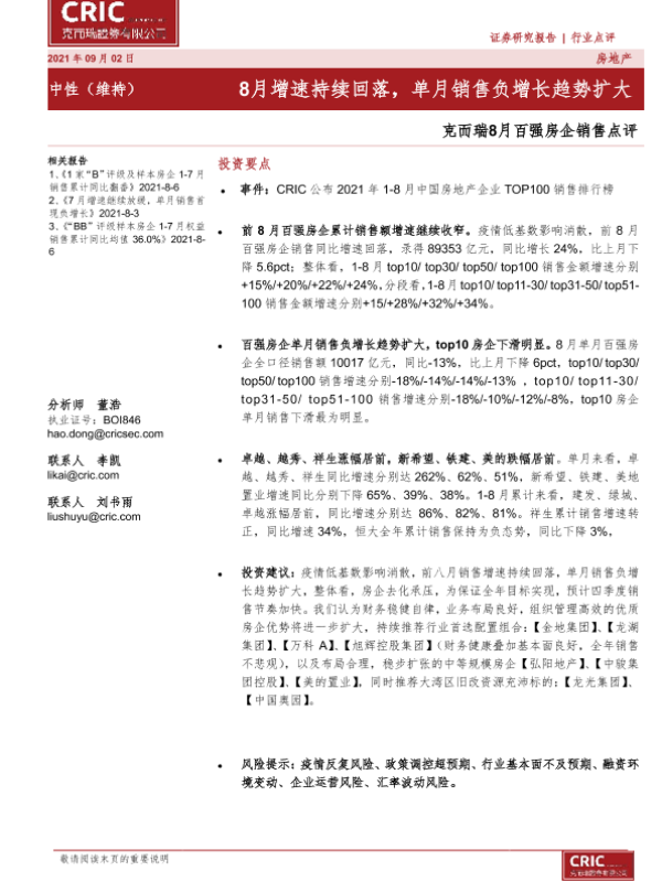 【克而瑞证券】【20210902】8月百强房企销售点评:8月增速持续回落,单月销售负增长趋势扩大-4页 行业研究