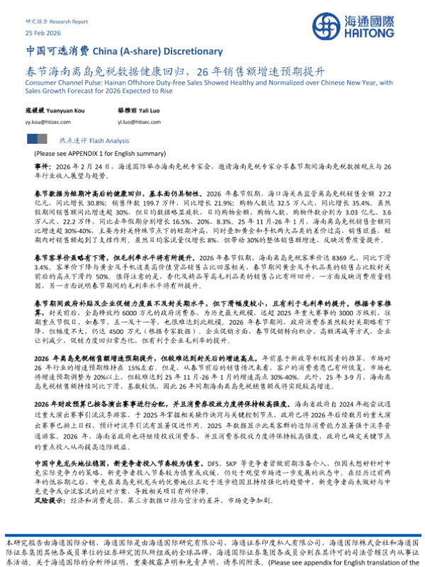 【海通国际】【202602】春节海南离岛免税数据健康回归,26年销售额增速预期提升-8页 证券期货研究报告