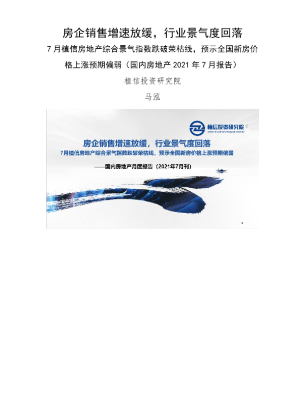 【植信投资研究院】【202107】国内房地产2021年7月报告:7月植信房地产综合景气指数跌破荣枯线,预示全国新房价格上涨预期偏弱-房企销售增速放缓,行业景气度回落-10页 行业研究
