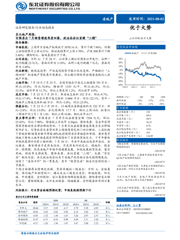 【东北证券】【20210802】东北地产周报:百强房企7月销售增速再度回落,政治局会议首提“三稳”-28页 行业研究