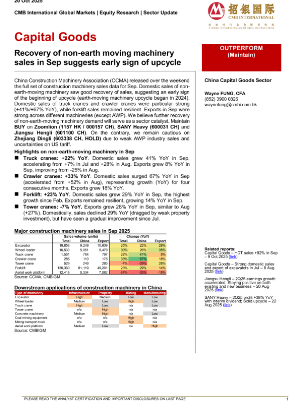 【CMB International Global Markets】【202510】Capital Goods- Recovery of non-earth moving machinery sales in Sep suggests early sign of upcycle-5页 证券期货研究报告
