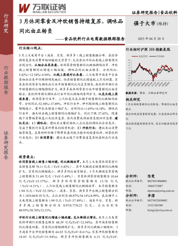 【万联证券】【20230420】3月休闲零食及冲饮销售持续复苏,调味品同比由正转负-13页 行业研究