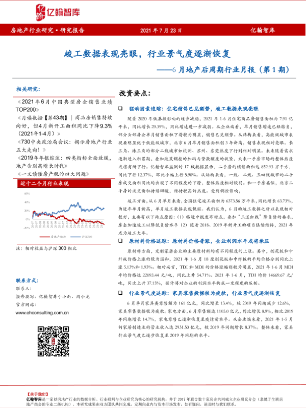 【亿翰智库】【20210723】6月地产后周期行业月报:竣工数据表现亮眼,行业景气度逐渐恢复-11页 行业研究