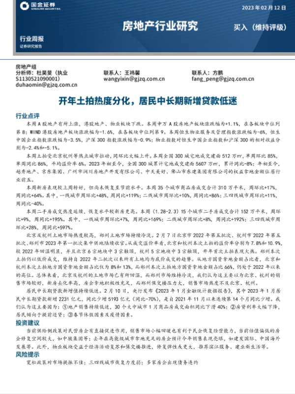 【国金证券】【20230212】开年土拍热度分化,居民中长期新增贷款低迷-18页 行业研究