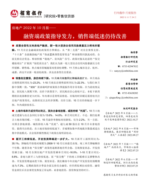【招商银行】【20221124】房地产2022年10月报:融资端政策指导发力,销售端低迷仍待改善-20页 行业研究