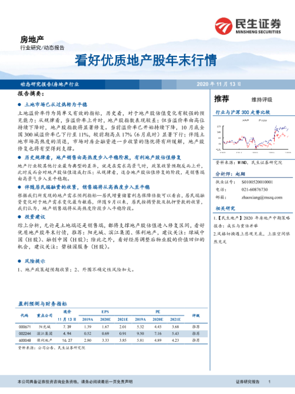 【民生证券】【20201113】房地产动态报告:看好优质地产股年末行情-8页 行业研究