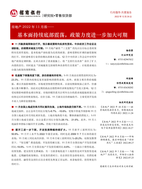 【招商银行】【20221226】房地产2022年11月报:基本面持续底部震荡,政策力度进一步加大可期-20页 行业研究