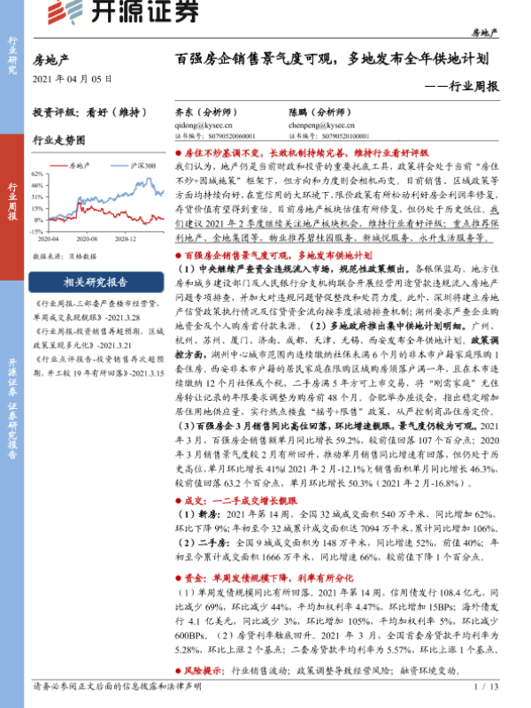 【开源证券】【20210405】房地产行业周报:百强房企销售景气度可观,多地发布全年供地计划-13页 行业研究
