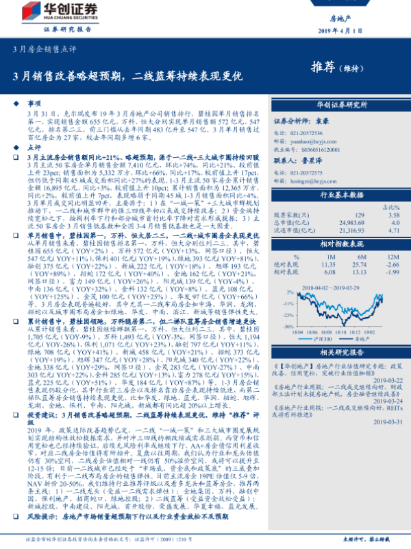 【华创证券】【20190401】3月份房企销售点评:3月销售改善略超预期,二线蓝筹持续表现更优-11页 行业研究