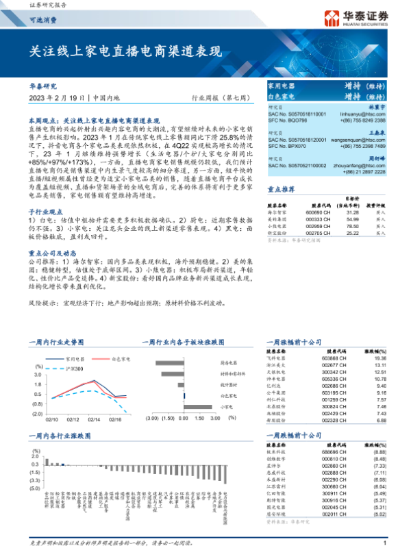 【华泰证券】【20230219】20230219-华泰证券-可选消费行业周报(第七周):关注线上家电直播电商渠道表现-16页 行业研究