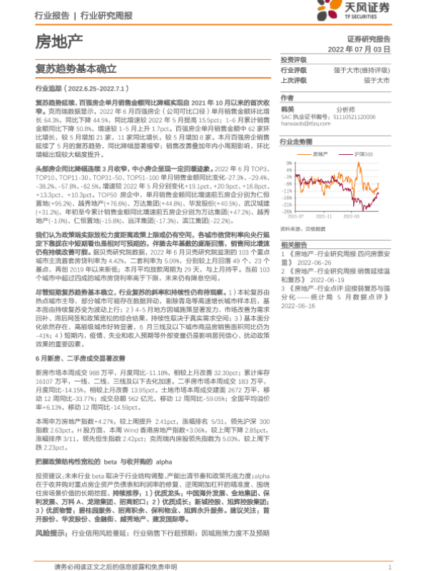 【天风证券】【20220703】房地产行业研究周报:复苏趋势基本确立-19页 行业研究