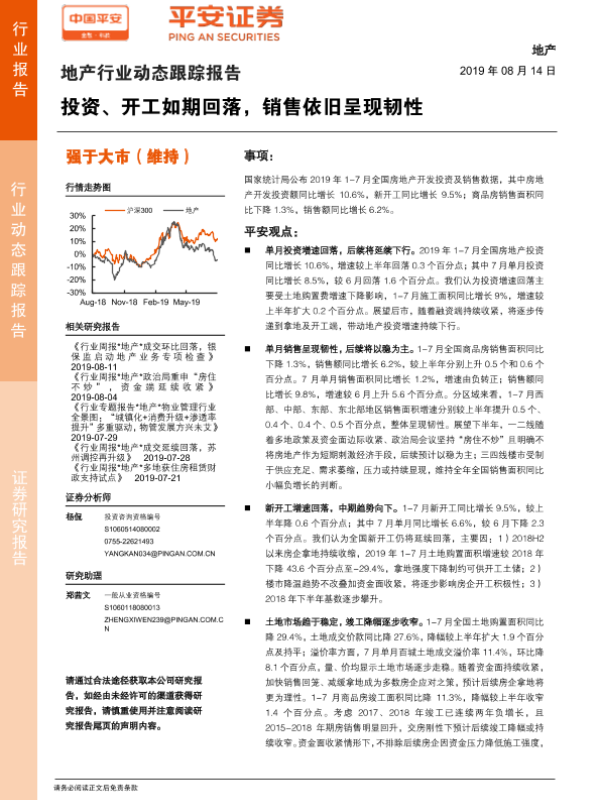 【平安证券】【20190814】地产行业动态跟踪报告:投资、开工如期回落,销售依旧呈现韧性-14页 行业研究