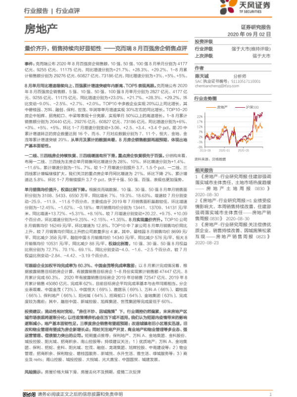 【天风证券】【20200902】克而瑞8月百强房企销售点评:量价齐升,销售持续向好显韧性-3页 行业研究