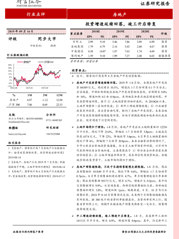【财信证券】【20190916】投资增速延续回落,竣工开启修复-3页 行业研究