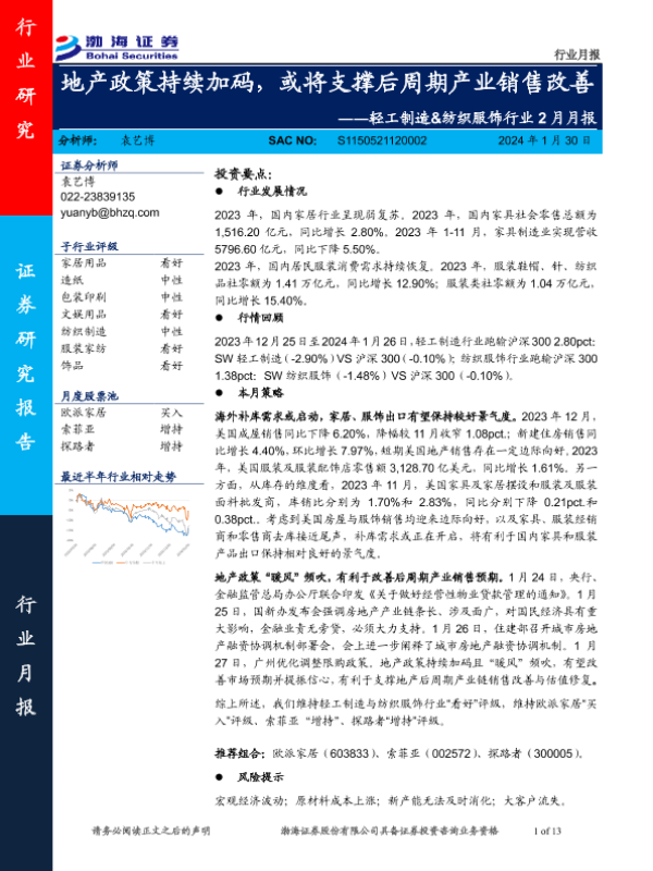 【渤海证券】【20240130】轻工制造&纺织服饰行业2月月报:地产政策持续加码,或将支撑后周期产业销售改善-13页 行业研究