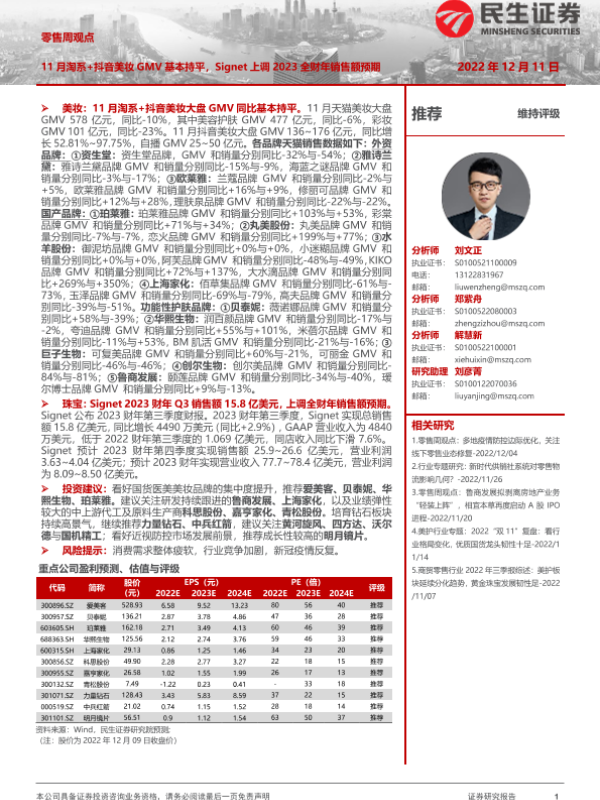 【民生证券】【20221211】零售周观点:11月淘系+抖音美妆GMV基本持平,Signet上调2023全财年销售额预期-18页 行业研究