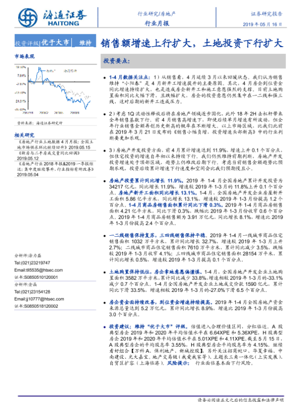 【海通证券】【20190516】房地产行业月报:销售额增速上行扩大,土地投资下行扩大-11页 行业研究