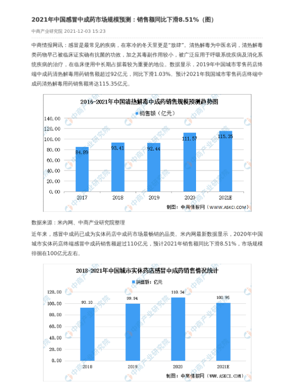 【中商产业研究院】【2021】2021年中国感冒中成药市场规模预测:销售额同比下滑8.51%-2页 行业研究