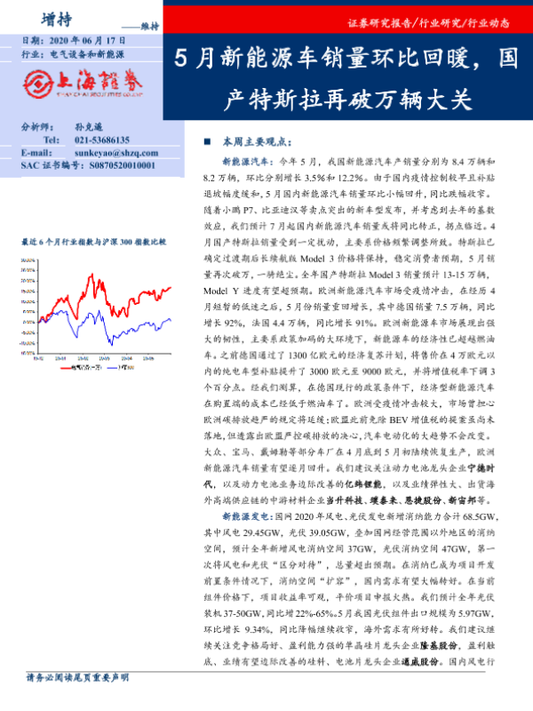 【上海证券】【20200617】5月新能源车销量环比回暖,国产特斯拉再破万辆大关-18页 行业研究