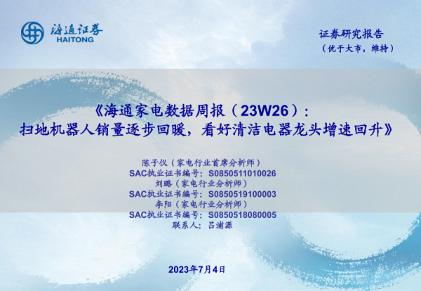 【海通证券】【20230704】海通家电数据周报(23W26):扫地机器人销量逐步回暖,看好清洁电器龙头增速回升-15页 行业研究