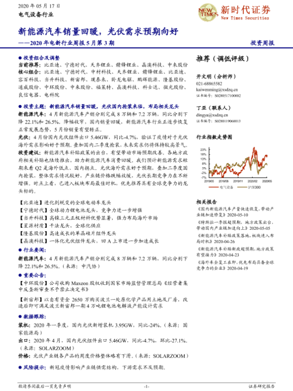 【新时代证券】【20200517】2020年电新行业周报5月第3期:新能源汽车销量回暖,光伏需求预期向好-13页 行业研究