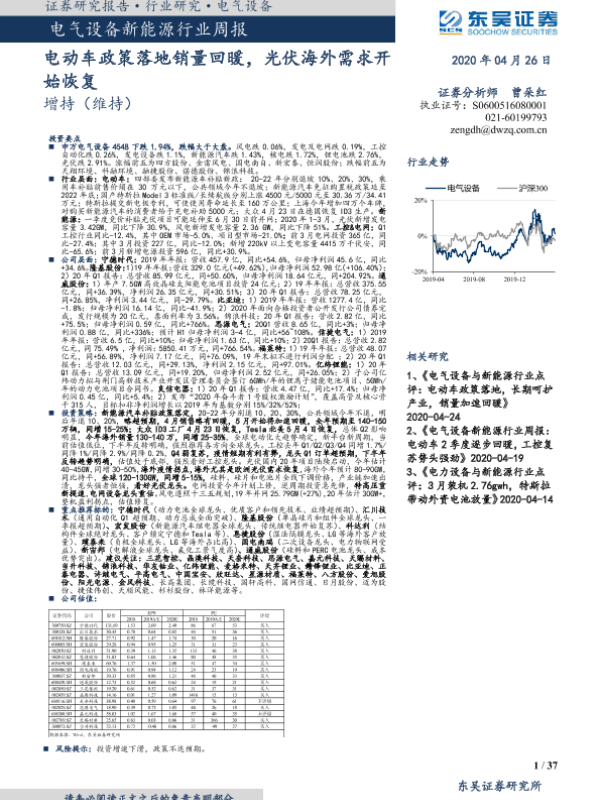 【东吴证券】【20200426】电气设备新能源行业周报:电动车政策落地销量回暖,光伏海外需求开始恢复-37页 行业研究
