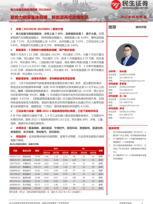 【民生证券】【20220605】电力设备及新能源周报:新势力销量集体回暖,新能源再吹政策东风-30页 行业研究