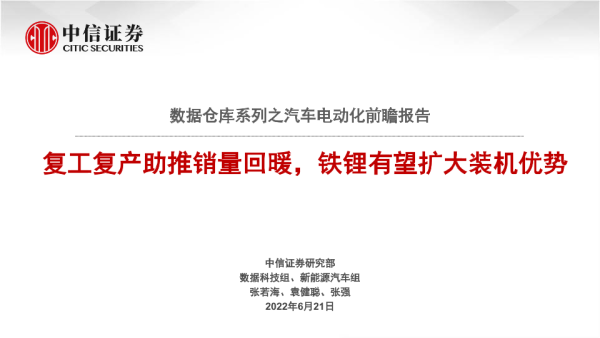 【中信证券】【20220621】新能源汽车行业数据仓库系列之汽车电动化前瞻报告:复工复产助推销量回暖,铁锂有望扩大装机优势-20页 行业研究