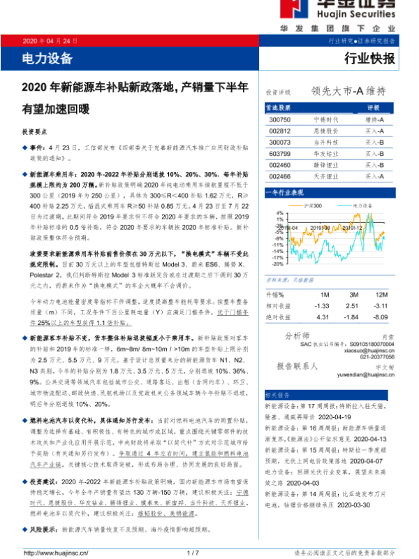 【华金证券】【20200424】2020年新能源车补贴新政落地,产销量下半年有望加速回暖-7页 行业研究