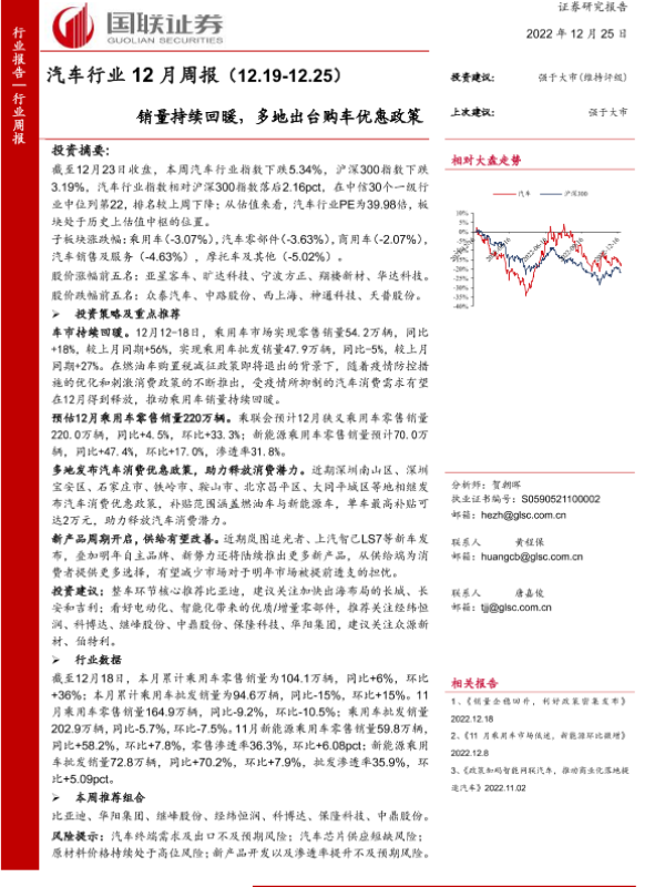 【国联证券】【20221225】汽车行业12月周报:销量持续回暖,多地出台购车优惠政策-19页 行业研究