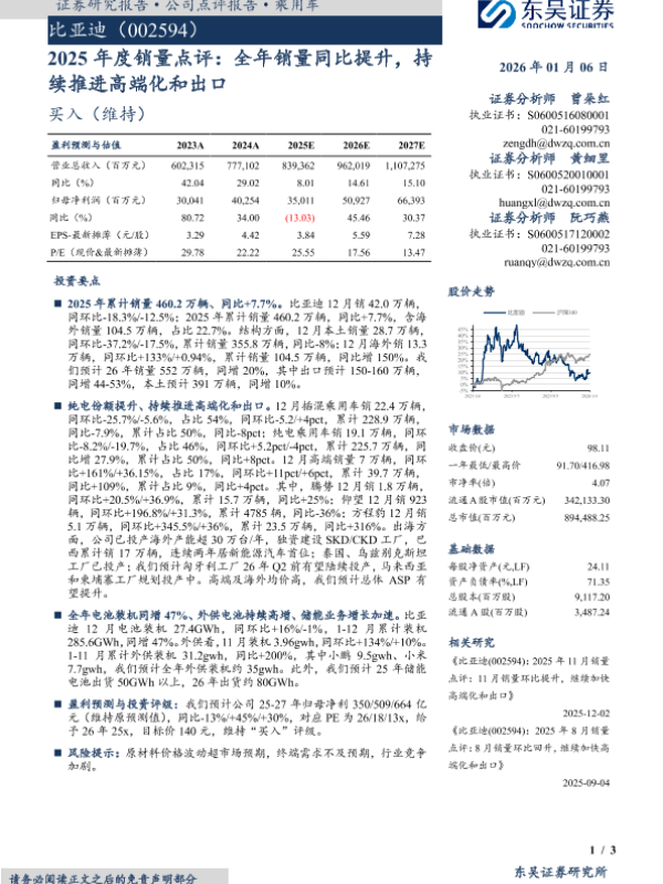【东吴证券】【202601】2025年度销量点评:全年销量同比提升,持续推进高端化和出口-3页 证券期货研究报告