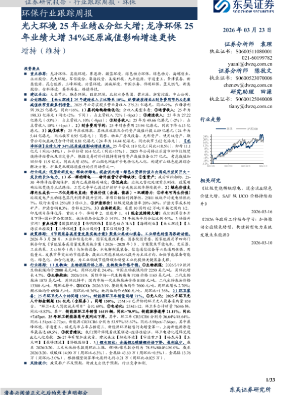 【东吴证券】【202603】环保行业跟踪周报:光大环境25年业绩&分红大增;龙净环保25年业绩大增34%还原减值影响增速更快-33页 证券期货研究报告