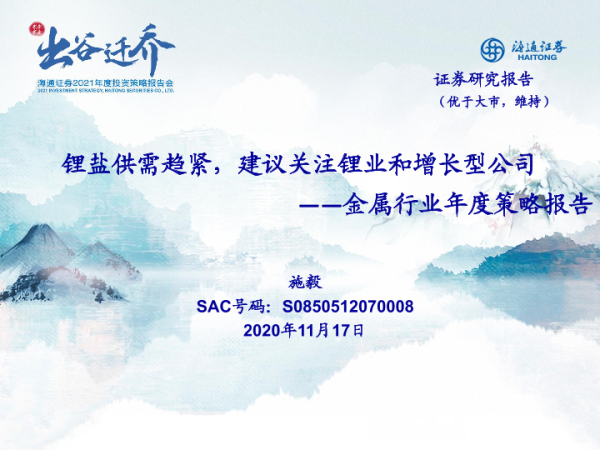 【海通证券】【20201117】金属行业年度策略报告:锂盐供需趋紧,建议关注锂业和增长型公司-11页 行业研究