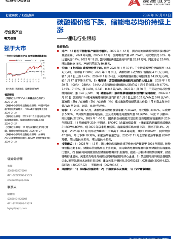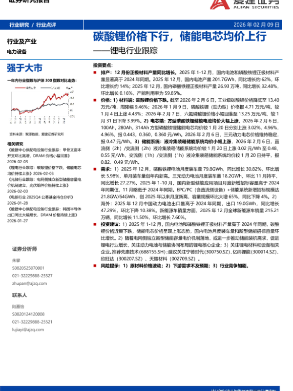 【爱建证券】【202601】锂电行业跟踪:碳酸锂价格下跌,储能电芯均价持续上涨-8页 证券期货研究报告