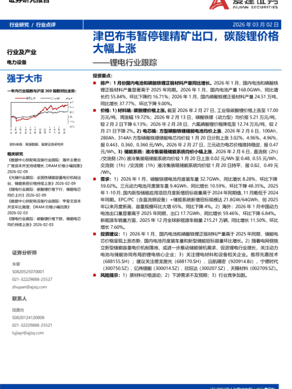 【爱建证券】【202602】锂电行业跟踪:碳酸锂价格下跌,储能电芯均价持续上涨-8页 证券期货研究报告