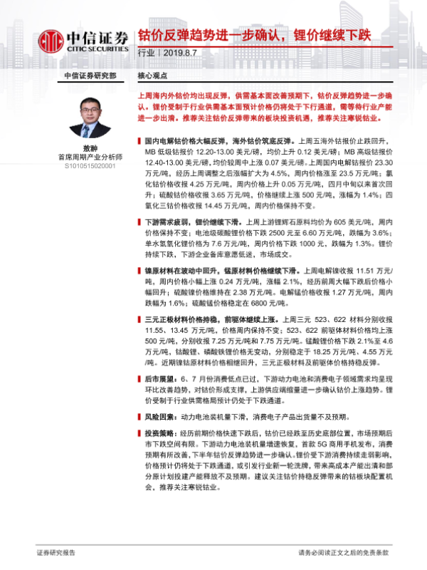 【中信证券】【20190807】有色金属行业:钴价反弹趋势进一步确认,锂价继续下跌-13页 行业研究