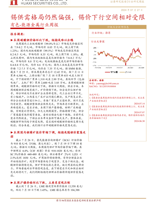 【华西证券】【20240727】20240727-华西证券-有色-能源金属行业周报:锡供需格局仍然偏强,锡价下行空间相对受限-28页 行业研究