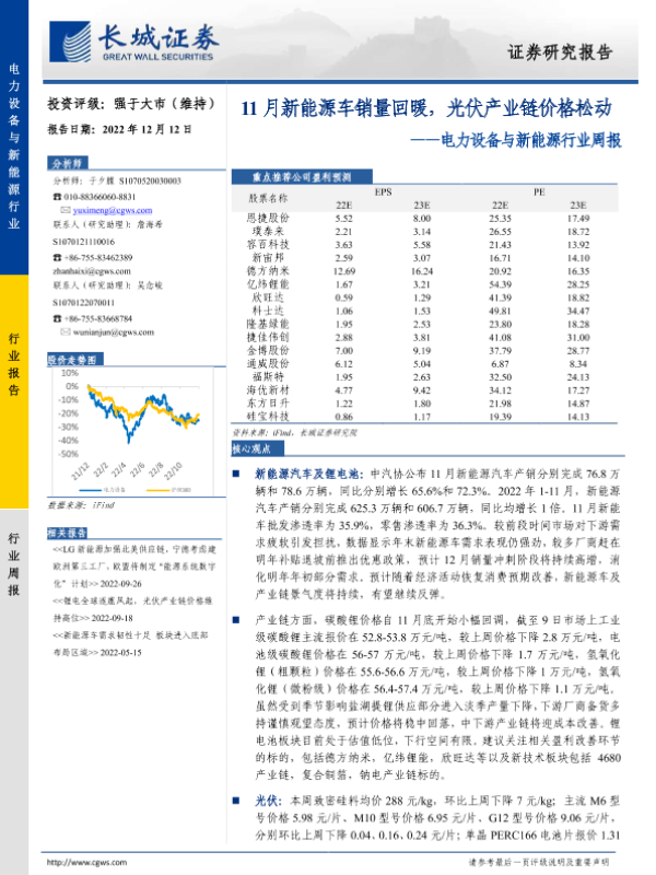 【长城证券】【20221212】11月新能源车销量回暖,光伏产业链价格松动-15页 行业研究