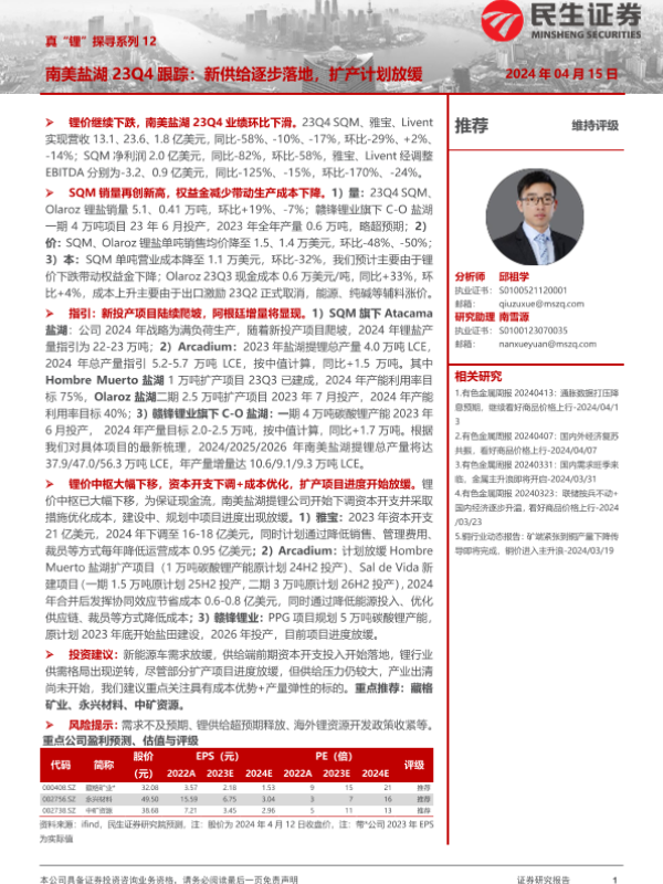 【民生证券】【20240415】南美盐湖23Q4跟踪:新供给逐步落地,扩产计划放缓-29页 行业研究
