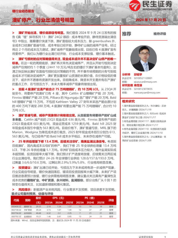 【民生证券】【20241120】锂行业动态报告:澳矿停产,行业出清信号明显-17页 行业研究