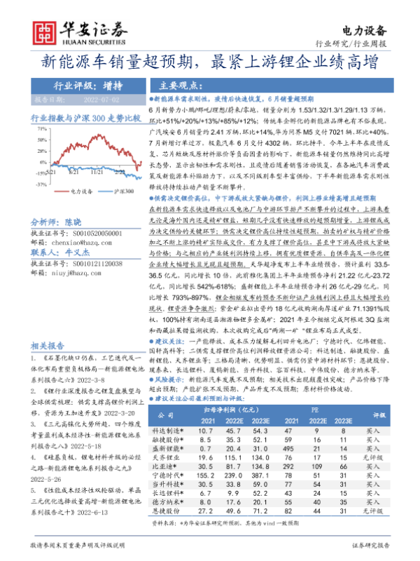 【华安证券】【20220702】电力设备行业周报:新能源车销量超预期,最紧上游锂企业绩高增-23页 行业研究